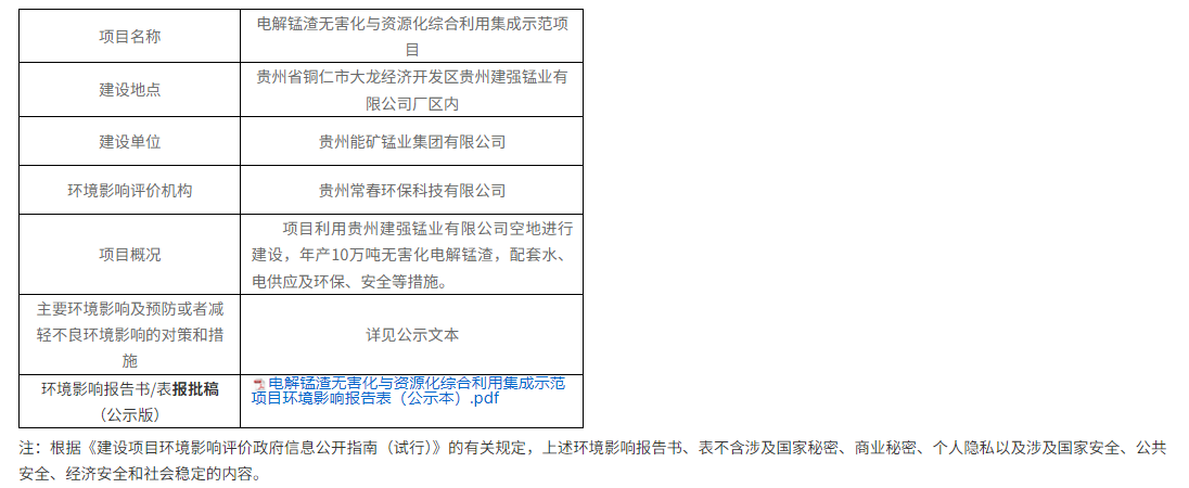 根據(jù)公示內(nèi)容:該項目利用貴州建強錳業(yè)有限公司空地進行建設(shè),年產(chǎn)10萬噸無害化電解錳渣,配套水、電供應(yīng)及環(huán)保、安全等措施。