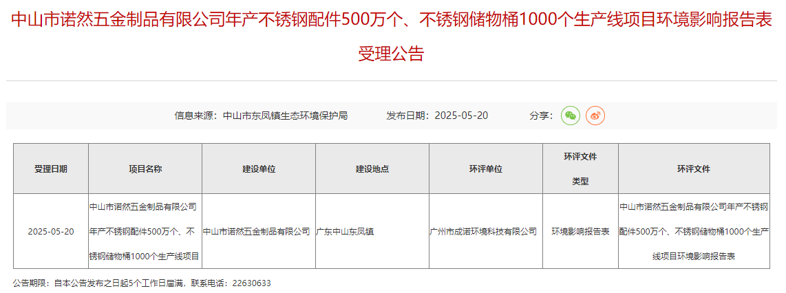 2025年5月20日,中山市東鳳鎮(zhèn)生態(tài)環(huán)境保護局受理中山市諾然五金制品有限公司年產(chǎn)不銹鋼配件500萬個、不銹鋼儲物桶1000個生產(chǎn)線項目環(huán)境影響報告表并對外進行公告,公告期:5個工作日。