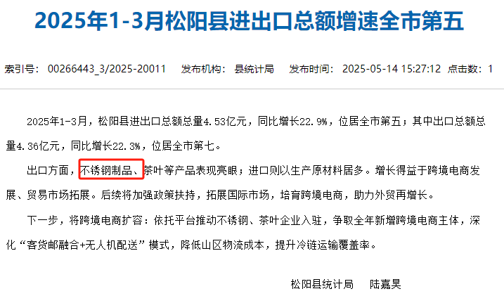 2025年5月14日,松陽縣統計局發布一文《2025年1-3月松陽縣進出口總額增速全市第五》。