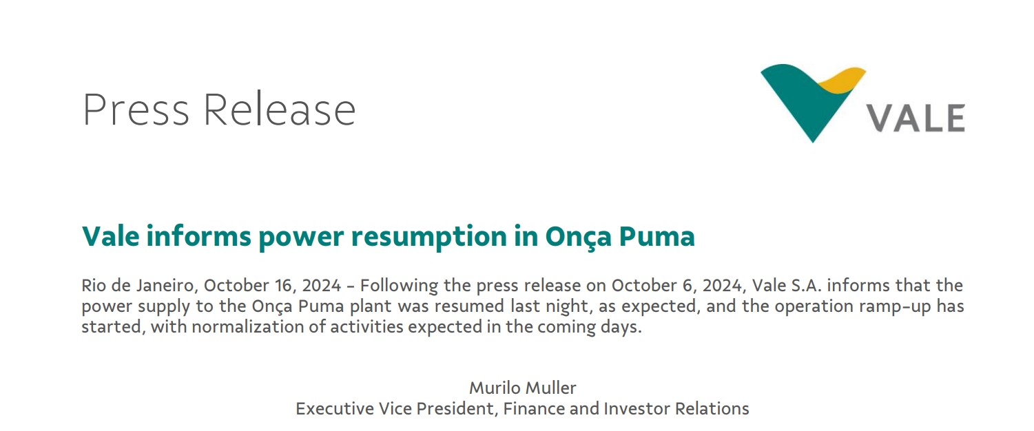 據(jù)淡水河谷公司10月16日消息,Onca Puma工廠的供電已于10月15日恢復(fù),目前生產(chǎn)爬坡工作已經(jīng)開始,預(yù)計(jì)未來幾天內(nèi)將恢復(fù)正常運(yùn)營。
