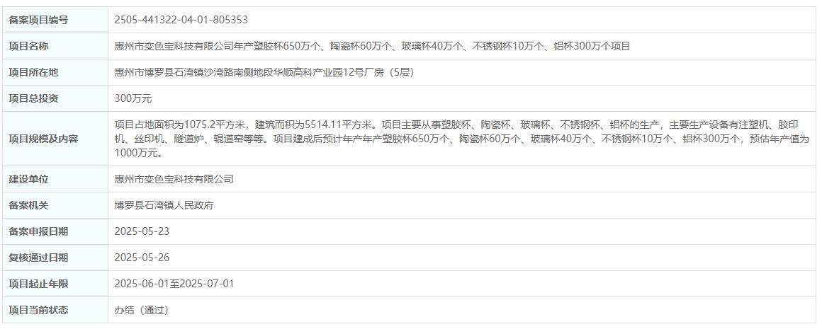 2025年5月26日,惠州市變色寶科技有限公司年產塑膠杯650萬個、陶瓷杯60萬個、玻璃杯40萬個、不銹鋼杯10萬個、鋁杯300萬個項目備案復核獲通過。